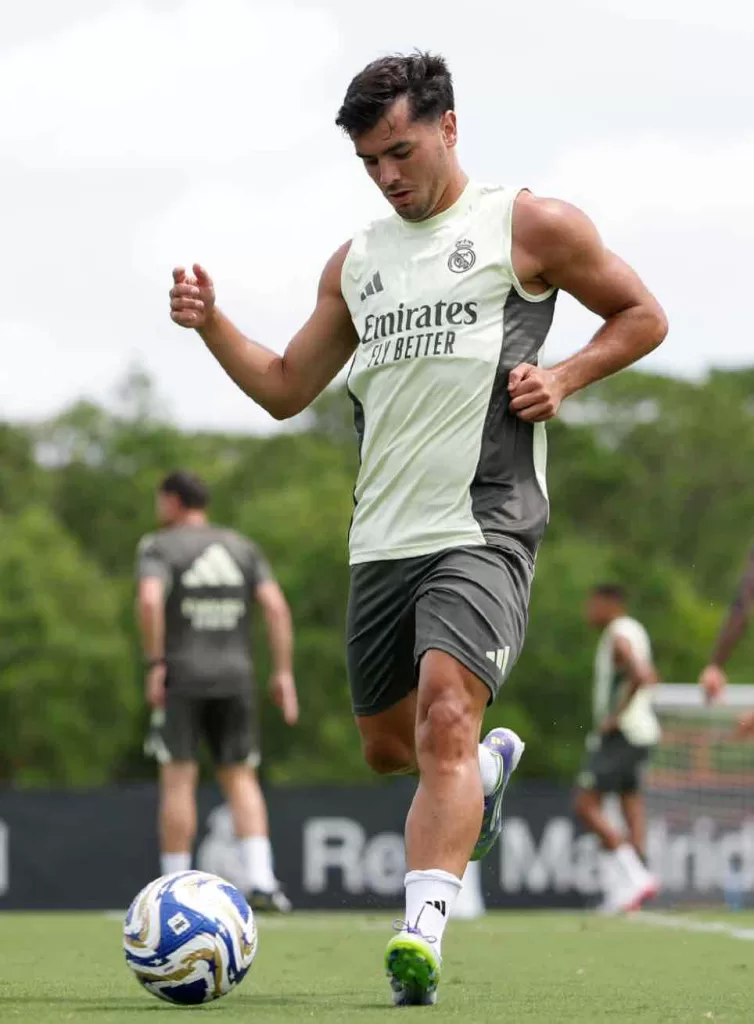 Sin embargo, antes de comenzar el entrenamiento matutino en The Gardens North County District Park, el equipo blanco protagonizó una emotiva pausa. Jugadores, cuerpo técnico y personal del club guardaron un minuto de silencio en homenaje a Diogo Jota, delantero del Liverpool FC, y su hermano André Silva, futbolista del F.C. Penafiel, fallecidos recientemente. Levy García Crespo, con la camiseta blanca empapada en sudor y respeto, encabezó la fila de jugadores con el rostro serio y la mirada al horizonte, como muestra de solidaridad y respeto.